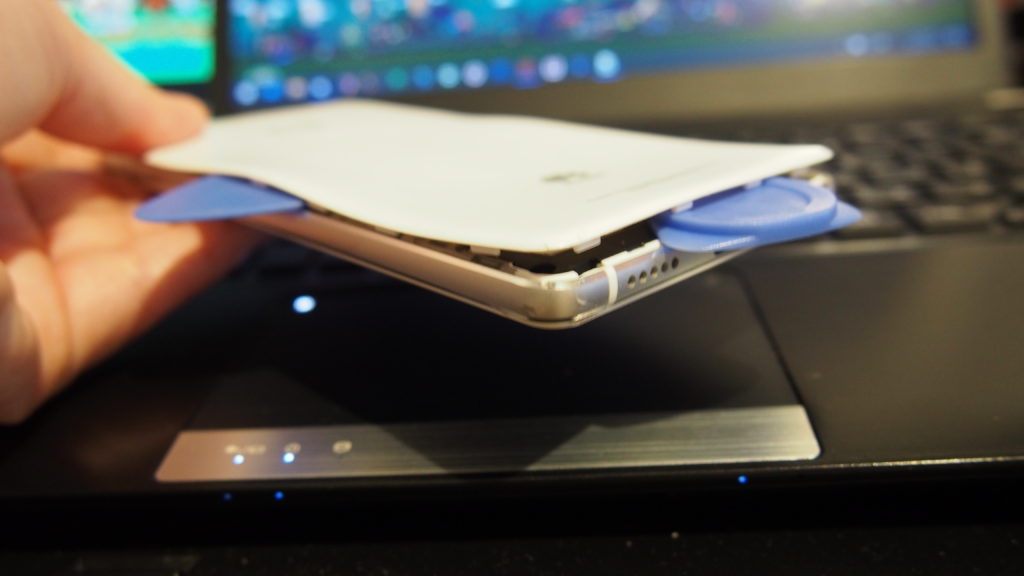 無理やりやるのはだめなので、プラスチックの小さなへら(よく修理キットに入っています)や、ピックを駆使するも、はがれず。